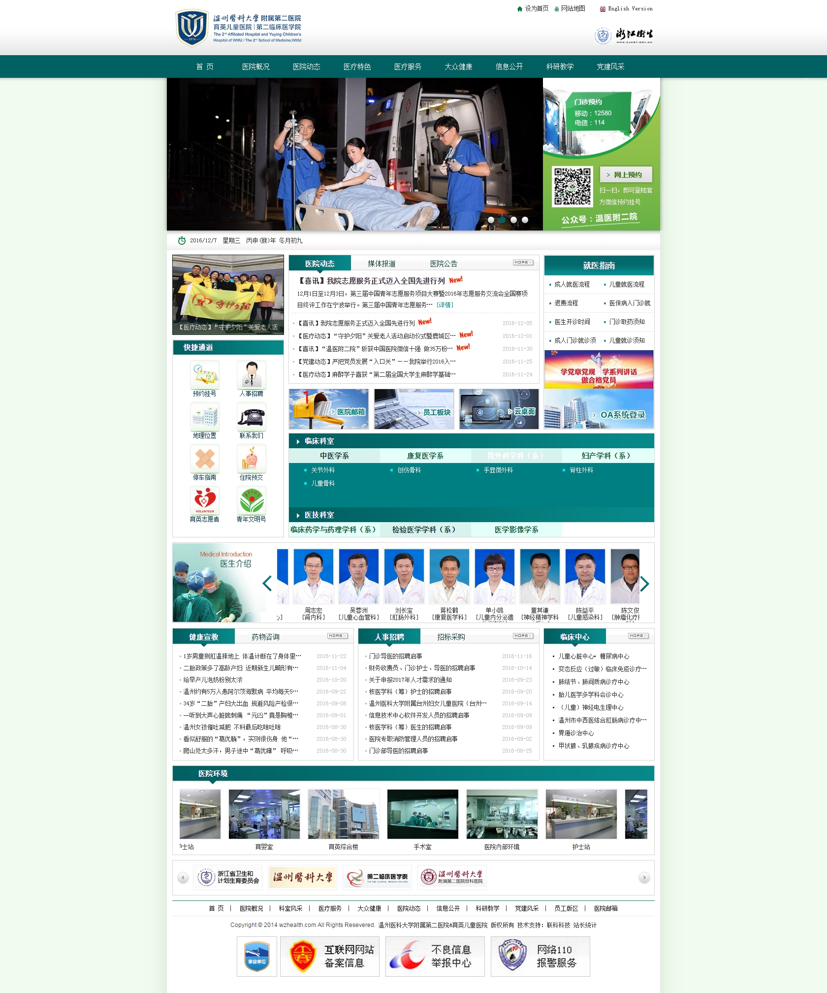 溫州醫(yī)科大學(xué)附屬第二醫(yī)院、育英兒童醫(yī)院座落于浙江省東南沿海之濱---溫州,是浙江省屬三級甲等綜合性醫(yī)院,系溫州醫(yī)科大學(xué)第二臨床醫(yī)學(xué)院。醫(yī)院始建于1976年,前身為“溫州醫(yī)學(xué)院白求恩門診部”,1982年經(jīng)浙江省衛(wèi)生廳批準(zhǔn)改建為溫州醫(yī)學(xué)院附屬第二醫(yī)院。1988年同時兼掛“兒童醫(yī)院”牌子。1991年在臺胞何朝育先生的捐助下,新建了兒童醫(yī)院大樓,同時將“兒童醫(yī)院”改名為“溫州醫(yī)學(xué)院附屬育英兒童醫(yī)院”。2004年浙江省衛(wèi)生廳授予我院“浙江省立育英醫(yī)院”牌子。2005年兼并溫州心血管病醫(yī)院,掛牌為附屬第二醫(yī)院南浦院區(qū)