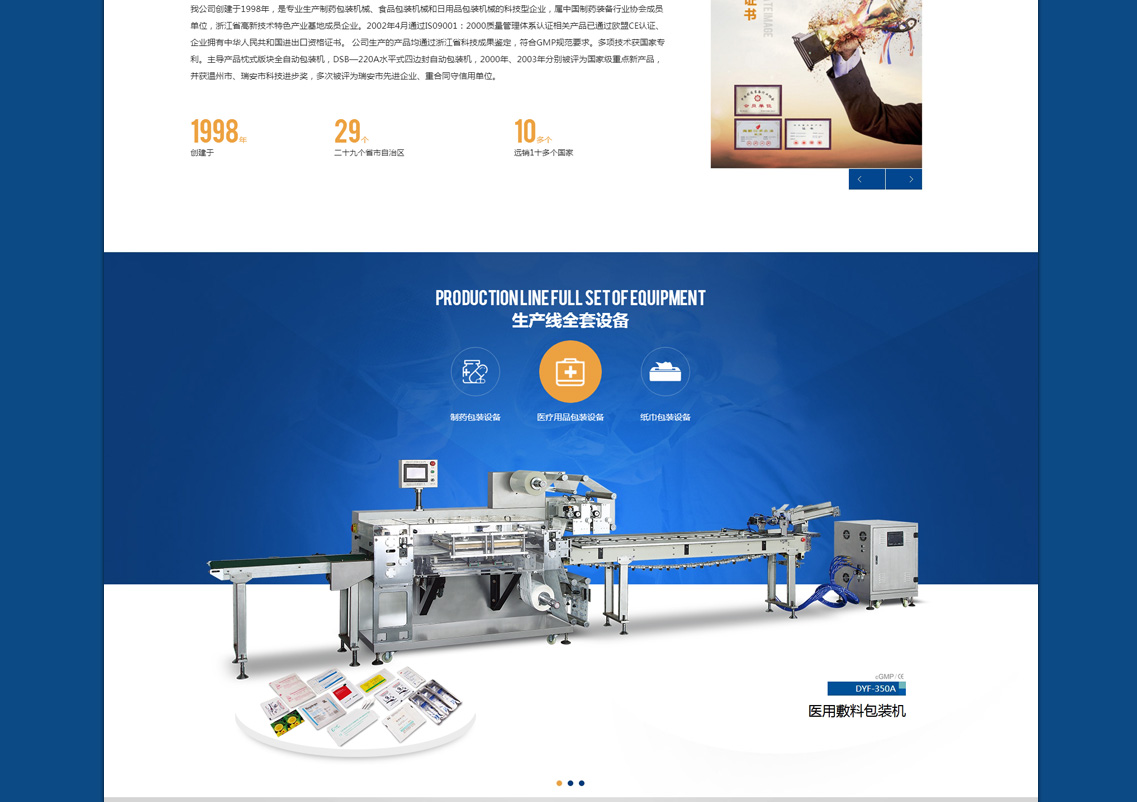 我公司創(chuàng)建于1998年,是專業(yè)生產制藥包裝機械、食品包裝機械和日用品包裝機械的科技型企業(yè),屬中國制藥裝備行業(yè)協(xié)會成員單位,浙江省高新技術特色產業(yè)基地成員企業(yè)。2002年4月通過IS09001:2000質量管理體系認證相關產品已通過歐盟CE認證、企業(yè)擁有中華人民共和國進出口資格證書。