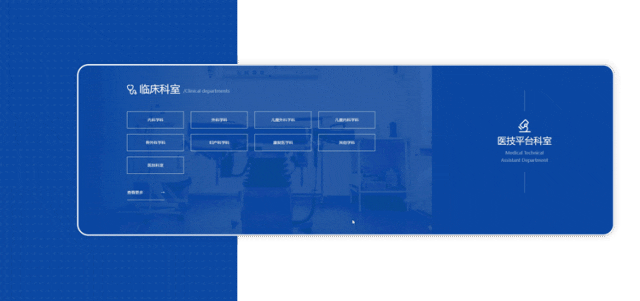 為了讓患者更好地了解醫(yī)院各個(gè)科室的特點(diǎn)和優(yōu)勢(shì),我們需要設(shè)計(jì)科室介紹的板塊。在設(shè)計(jì)中,我們使用背景圖片來展示科室的特點(diǎn)和設(shè)施情況。同時(shí)還可以設(shè)置互動(dòng)環(huán)節(jié),其中兩大科室的來回切換,可以讓患者快捷使用和清楚知曉科室的所屬,讓患者更好地了解各個(gè)科室的情況。