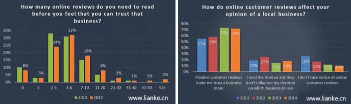 圖2:85%的消費(fèi)者表示,他們閱讀10+(左)&72%的消費(fèi)者表示正面評(píng)價(jià)使他們信任加深(右)