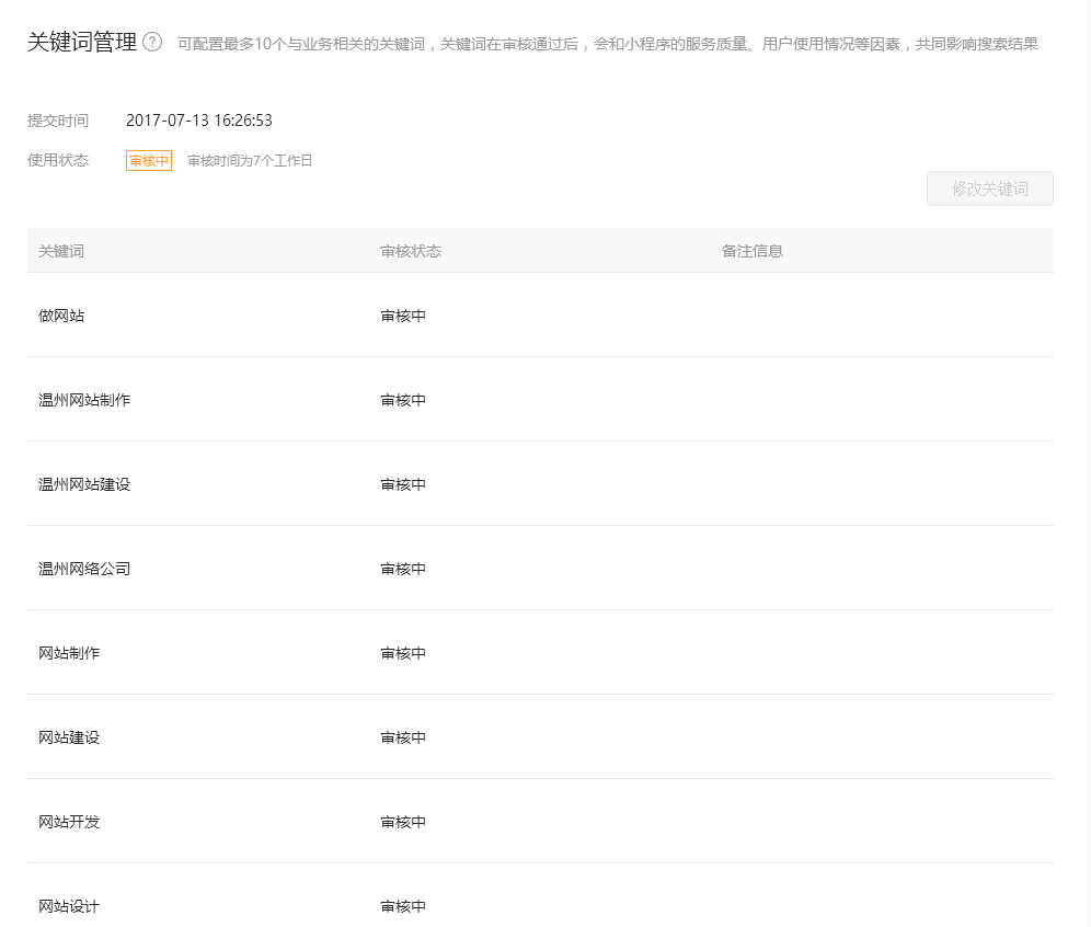 由于小程序關(guān)鍵字個(gè)數(shù)有限,只能添加10個(gè),建議一次性添加齊全,畢竟有7天的審核日期,而且規(guī)定是和小程序業(yè)務(wù)相關(guān)詞才能通過。