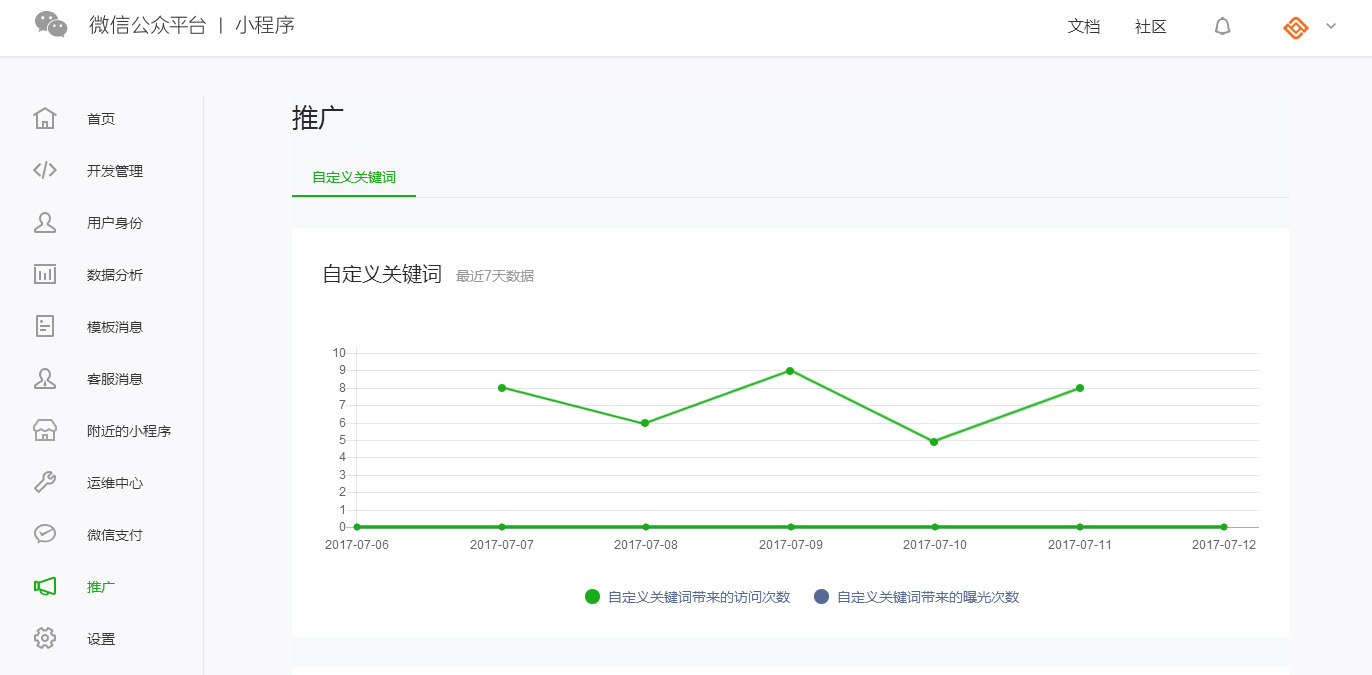 可在小程序后臺(tái)的 “推廣” 模塊中,查看通過自定義關(guān)鍵詞帶來的訪問次數(shù)。