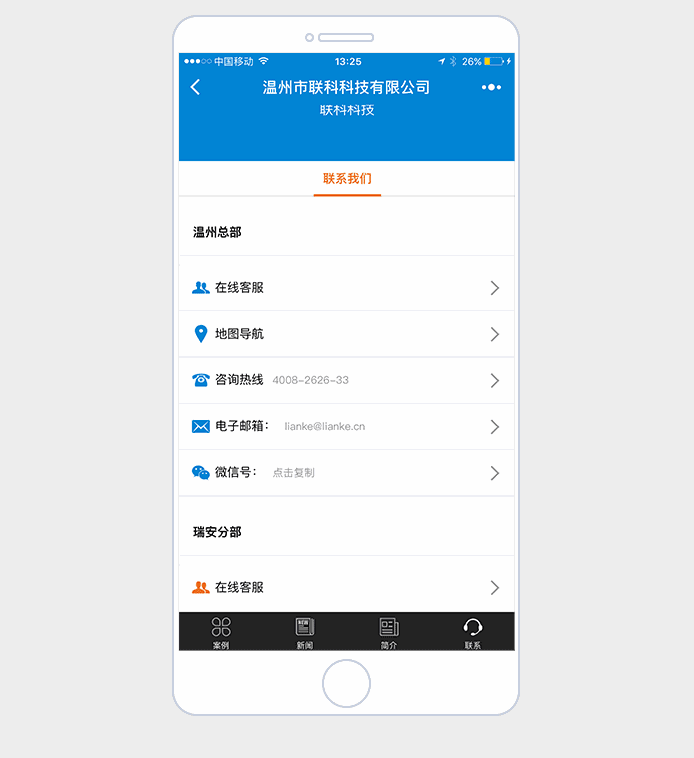 在聯(lián)系我們欄目中點擊“微信號”按鈕,快速復(fù)制微信號,完成添加微信好友的功能,達到瀏覽者于企業(yè)平臺之間的直接對接,提高營銷精準度與好感度;